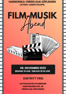 Film-Musik-Abend Veröffentlicht am 8. November 20256. Oktober 2025 von Veranstalter Datum / Uhrzeit 08.11.2025, 19:00 - 21:00 Uhr Veranstalter Harmonika-Verein Ulm-Söflingen Veranstaltungsort Katholisches Pfarrheim Söflingen, Ulm-Söflingen Kategorien Konzerte, Festivals