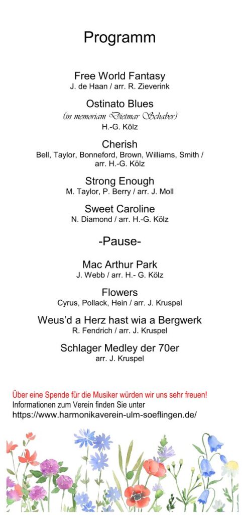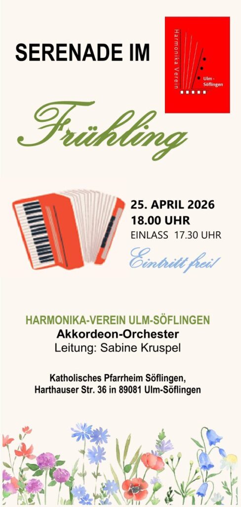 Serenade im Frühling Veröffentlicht am 25. April 202623. März 2026 von Veranstalter Datum / Uhrzeit 25.04.2026, 18:00 - 20:00 Uhr Veranstalter Harmonika-Verein Ulm-Söflingen Veranstaltungsort Katholisches Pfarrheim Söflingen, Ulm-Söflingen Kategorien Konzerte, Festivals
